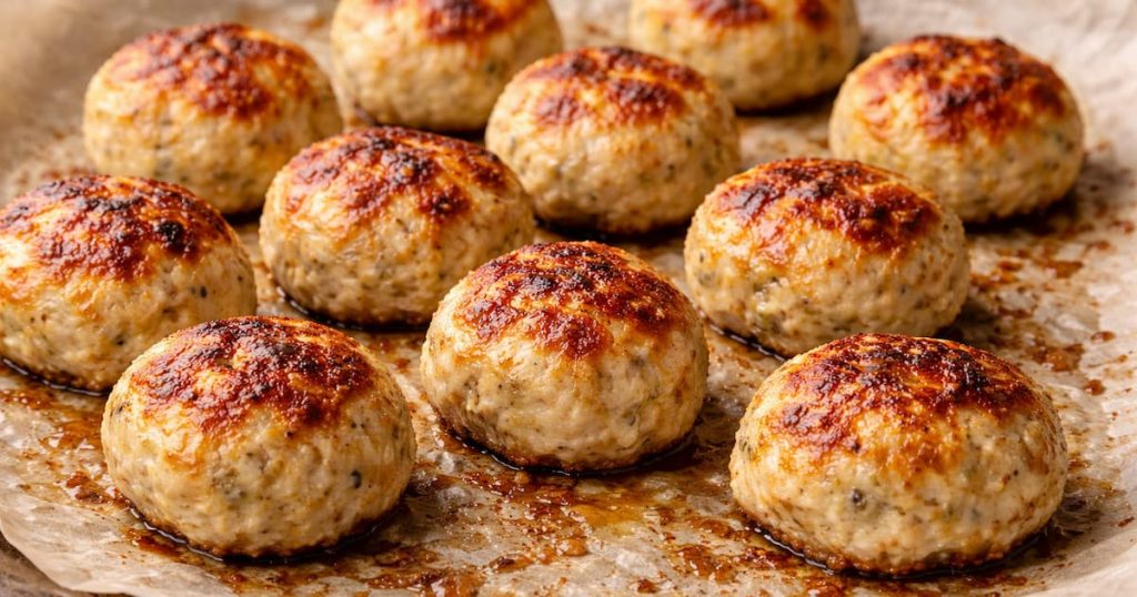 Albóndigas artesanales de pollo sin rellenos innecesarios. Selladas en sartén y terminadas al horno para una textura profesional.